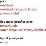 ![]() | ProefjestipDe twee nieuwe proefjes gaan allebei over drijven en zinken. Heb je een leuk proefje gedaan en wil je nog meer proefjes doen over dat onderwerp? Klik dan op één van de trefwoorden onderaan het proefje. |